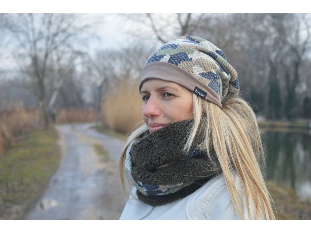 Módne doplnky Šále Set Nákrčník Army green + UNI zimná čiapka